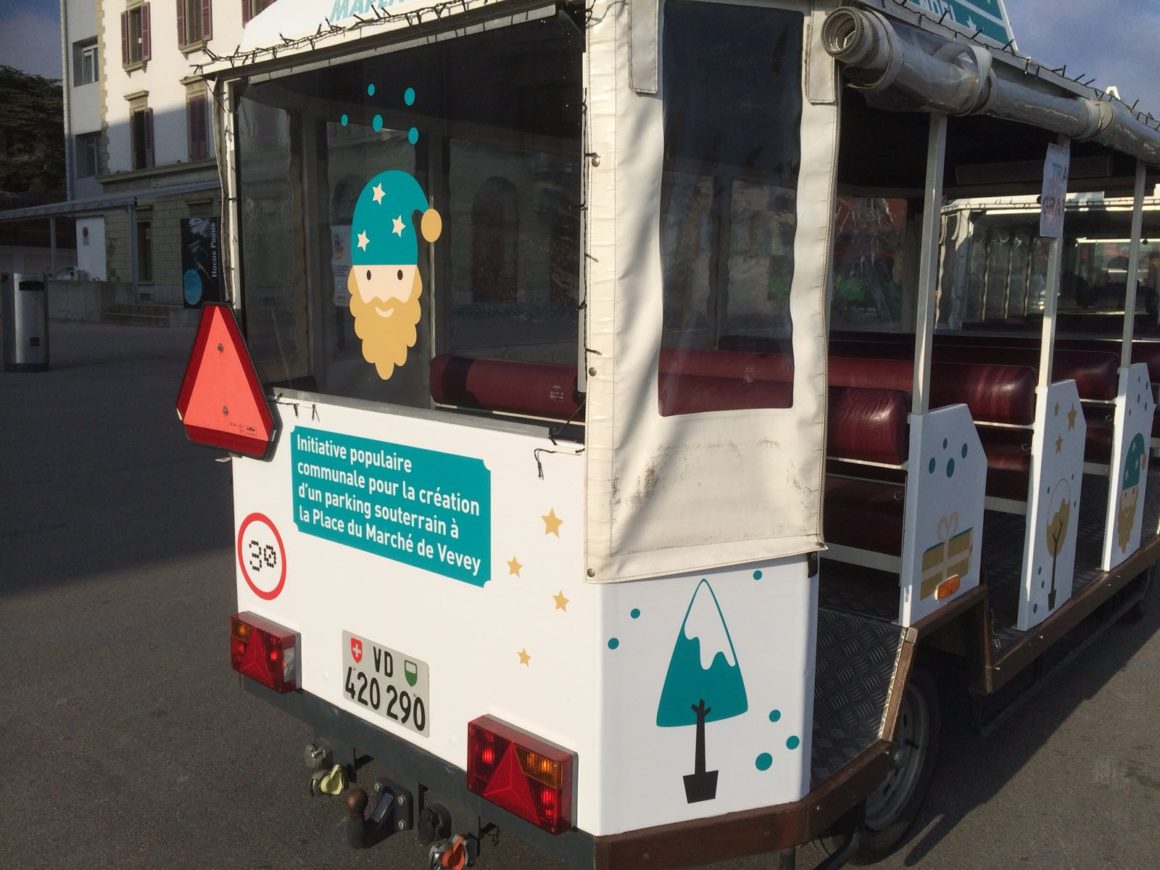 Développement d’une stratégie de communication étendue : concept « ma place », logotype, slogans, création graphique de supports médias, animation projetée au cinéma, etc. En parallèle, conception d’un event avec, pour mission : recouvrir la Place du Marché de ballons colorés (symboles d’espaces verts) ! Ou encore, habillage d’un petit train de Noël qui offre une balade dans la vieille ville… L’initiative aboutit sur une note positive en 2018 avec la récolte de près de 2’500 signatures.